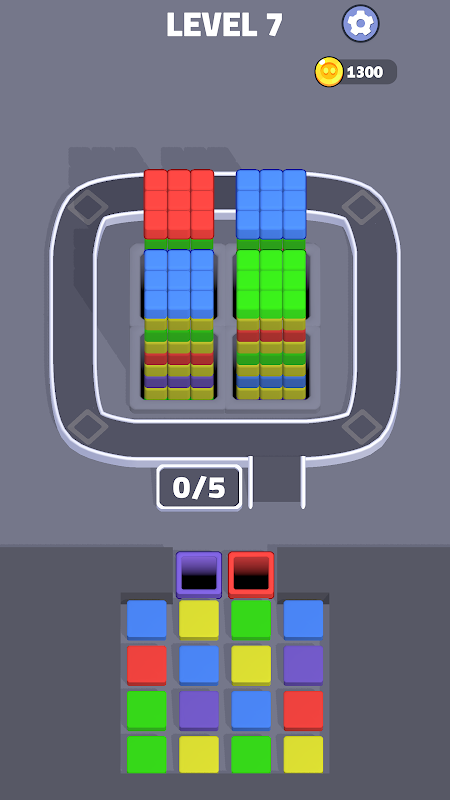 Apenas cubos livres — sem nenhum bloco acima deles — podem ser coletados, então cada movimento remodela a torre e abre novas possibilidades. Cada buraco tem uma capacidade limitada e, uma vez preenchido com cubos da sua cor, ele se completa e desaparece da esteira, abrindo espaço para o próximo movimento estratégico.