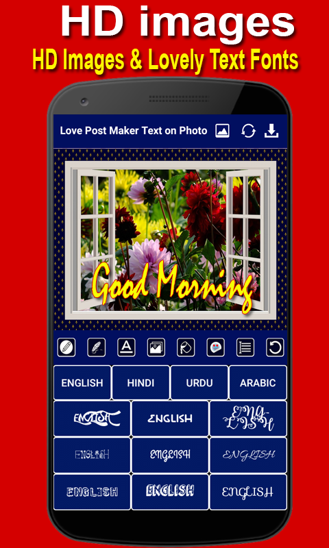 Poetry now added that helps you to make your posts more attractive and beautiful .now write your text on photos in multi languages .text on photo option helps you to design posts for different events mean now you can design your posts by writing your text on beautiful HD background images.Write your text in multi language like English,Urdu,Hindi and Arabic.Multi Language option makes your designing beautiful.