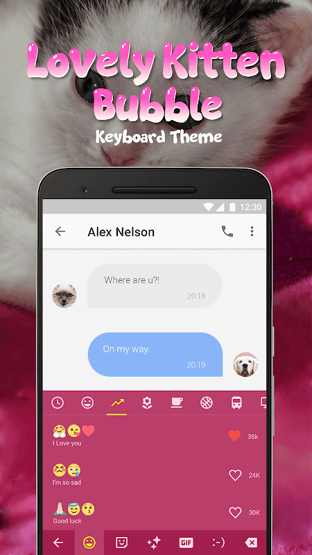 -Lovely Kitten Bubble Keyboard Theme for Snapchat only works with Facemoji Keyboard + GIFS installed on your phone. If you don’t have it, you will be automatically led to the Google Play download link, then download and choose Facemoji Keyboard + GIFS as your default keyboard.