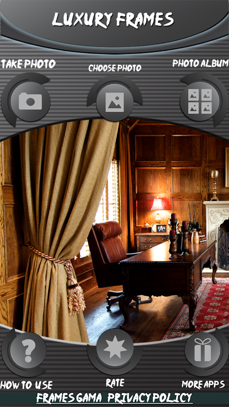 Nós preparamos mais de 20 quadros de fotos para você e você pode usar todos eles se desejar. Talvez o seu favorito seja aquele com sala de estar com rochas como decoração na parede? Você pode ver uma lareira e um sofá ao lado e você pode imaginar-se sentado e lendo seu livro favorito enquanto o fogo cruza e faz sons pacíficos. Os mais recentes ☎Luxury Frames☎ também oferecem cena com mesa de bilhar e você pode imaginar jogar bilhar com seus amigos e desfrutar de uma tarde tranquila. Você também pode encontrar quadros com quartos, cozinhas e banheiros nesta aplicação superior e é certo que você vai adorar todos, porque eles são incríveis.