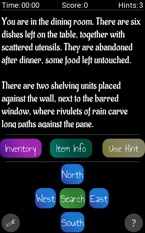 Mansion Escape is a text adventure game, in the style of the early computer-game era but updated for modern audiences. You have an hour to escape from a mansion where you have been inexplicably locked, at the same time discovering the truth behind your imprisonment. You search for clues and solve puzzles, all while the clock is ticking!