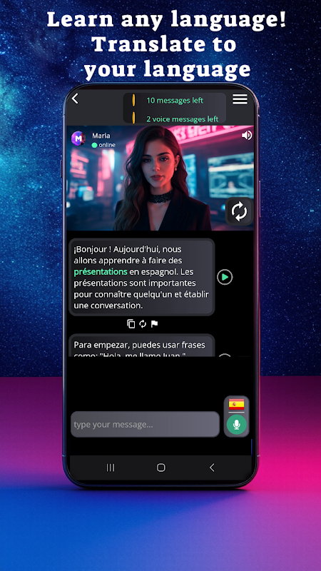 Procurando a melhor maneira de praticar e melhorar suas habilidades linguísticas? Conheça seu professor pessoal de IA! Nosso aplicativo permite que você converse, fale e aprenda de uma forma divertida e interativa, cobrindo centenas de tópicos em vários idiomas (inglês, espanhol, hindi, coreano, japonês, tâmil, télugo, francês, alemão, português, italiano, árabe, hebraico, holandês, polonês, russo, ucraniano, tailandês, filipino, urdu, uzbeque, suaíli, vietnamita, chinês e muito mais). Seja você um aluno iniciante ou avançado, esta é sua ferramenta completa para aumentar sua fluência com conversas de IA em tempo real.
