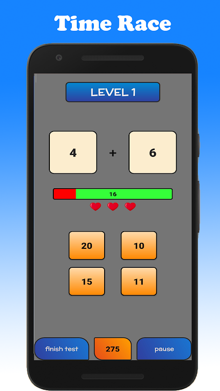 - Time Challenge: Solve math questions over time. You are going to have less time for every question you have solved.