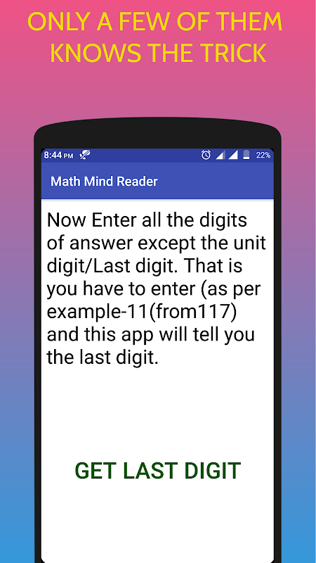 Este aplicativo contém o truque base matemática secreta também pelo qual o aplicativo irá respondê-lo o último dígito do seu número final que está aberto a seus usuários.