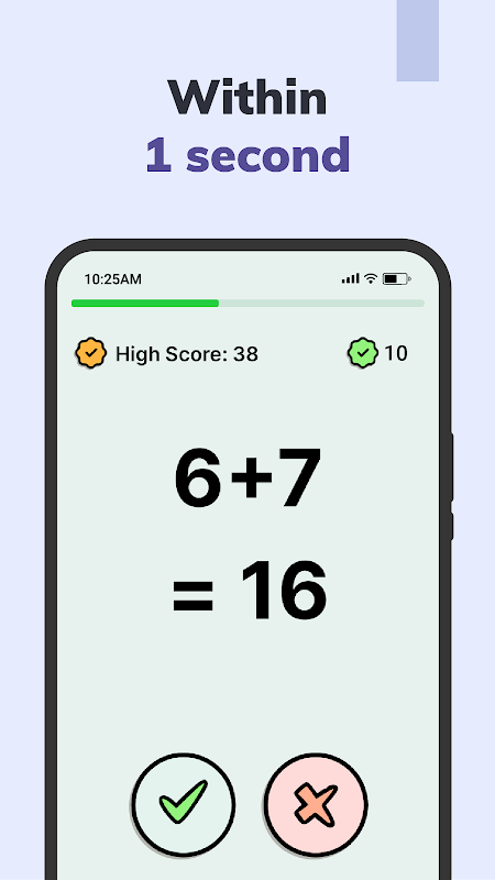 No Math Rush, tudo se resume a raciocínio rápido e cálculos na velocidade da luz. Com um formato de jogo simples, mas envolvente, você verá uma série de equações de adição e subtração. Sua tarefa? Determine se cada equação está correta ou incorreta antes que o tempo acabe!