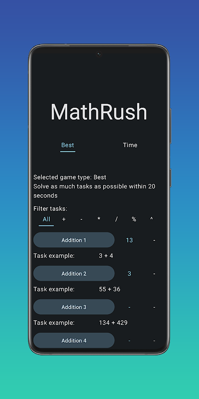 O MathRush é um jogo emocionante e rápido projetado para ajudar os usuários a exercitar suas habilidades aritméticas básicas. Se você é um estudante que procura aprimorar suas habilidades matemáticas ou apenas alguém que gosta de uma experiência desafiadora e estimulante para o cérebro, este jogo é perfeito para você.