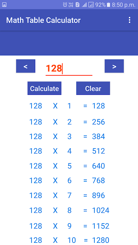 Calcula Math Tables até 99999999 e os números decimais com 20 múltiplos.