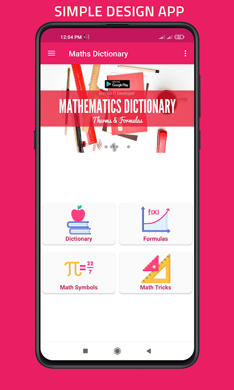 dicionário e fórmula matemática é um aplicativo completo para alunos e professores e contém mais de 5500 terminologia matemática cobrindo todos os termos e conceitos matemáticos comumente encontrados, e também símbolos matemáticos e truques matemáticos e todas as fórmulas básicas em matemática Inclui: