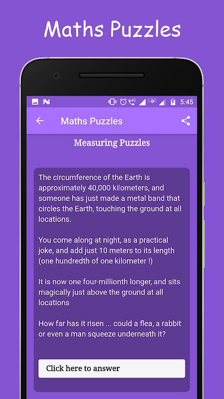 An objective of math puzzles apps is to learn mathematics in an interesting way. You as a player will come across with different tricky math problems, Utilize your brain & find a hidden pattern from given puzzles to achieve the solution. So test your logical & observation skill as well as train your brain in a funny way.