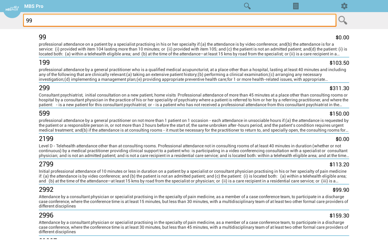 MBS Pro gives you quick and easy access to the complete Australian Medicare Benefits Schedule (MBS) fee schedule alongside data from RMFS, health funds and other sources. Through folders, favourites and a powerful search technology it gets you the right information you need in a few quick touches.
