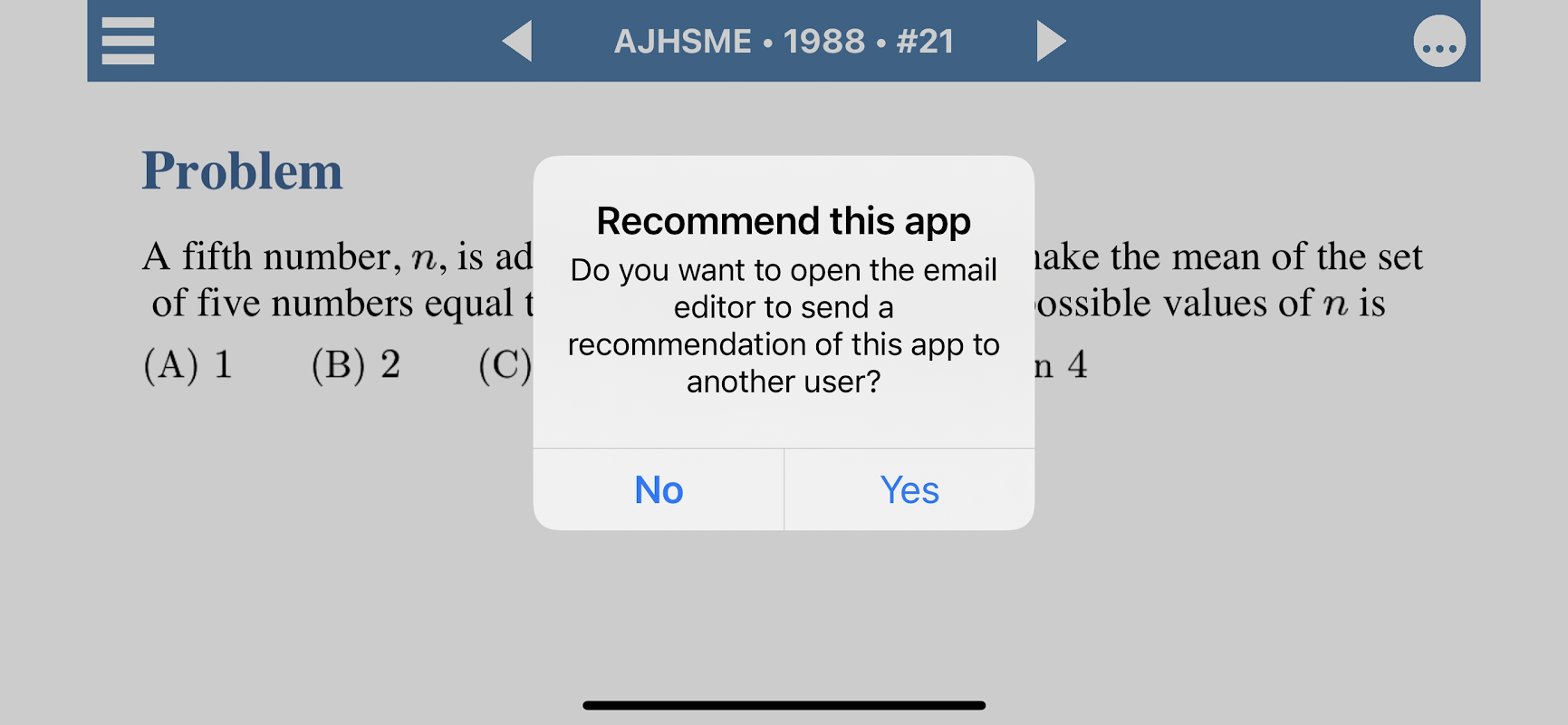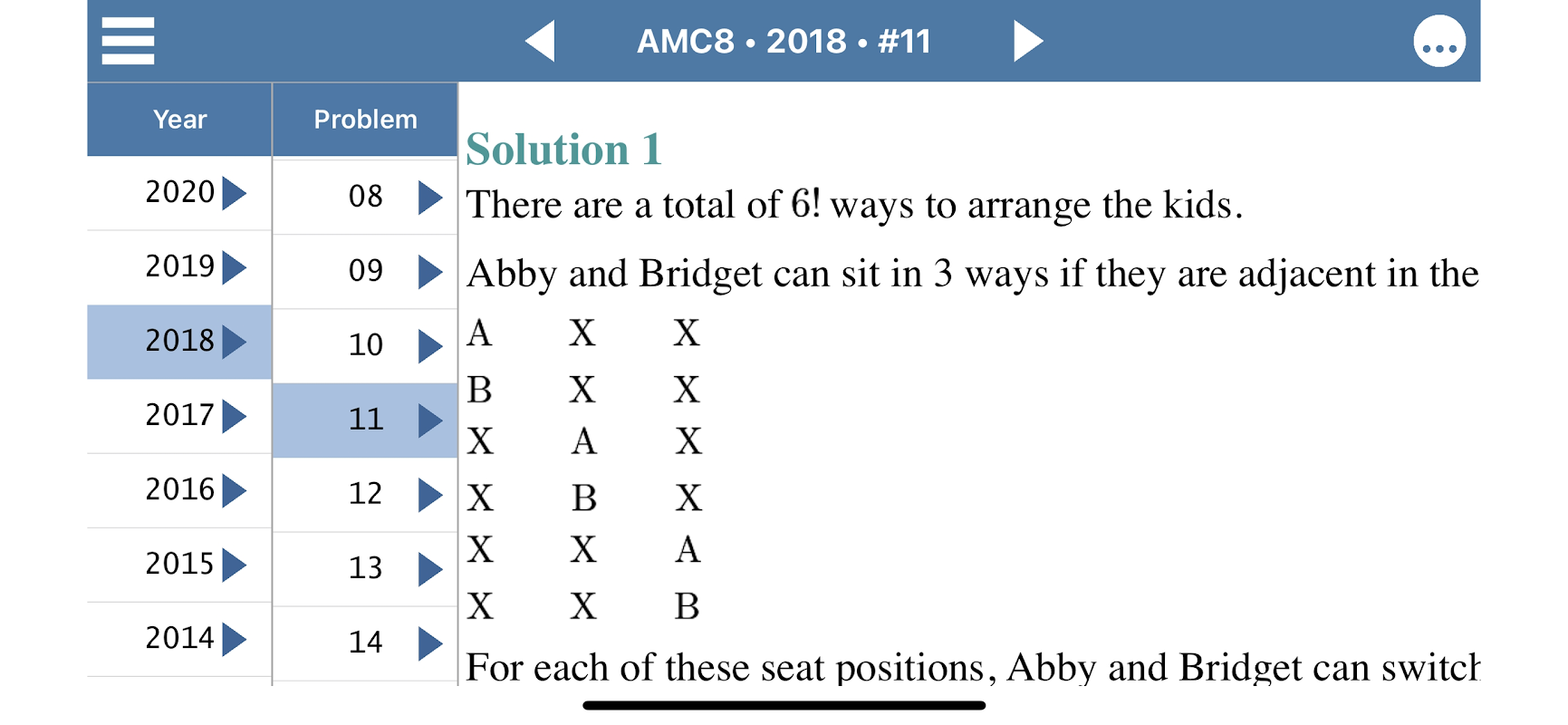 Este aplicativo contém todos os problemas e soluções do American Junior High School Mathematics Examination (AJHSME) de 1985 a 1998. Além disso, contém todos os problemas e soluções das Competições Americanas de Matemática (AMC 8 para alunos da 8ª série e abaixo) de 1999 até hoje.