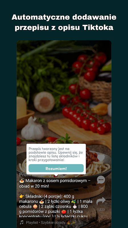✅ Adicione receitas do TikTok instantaneamente – Salve seus pratos favoritos em segundos, sem precisar digitar uma única palavra.