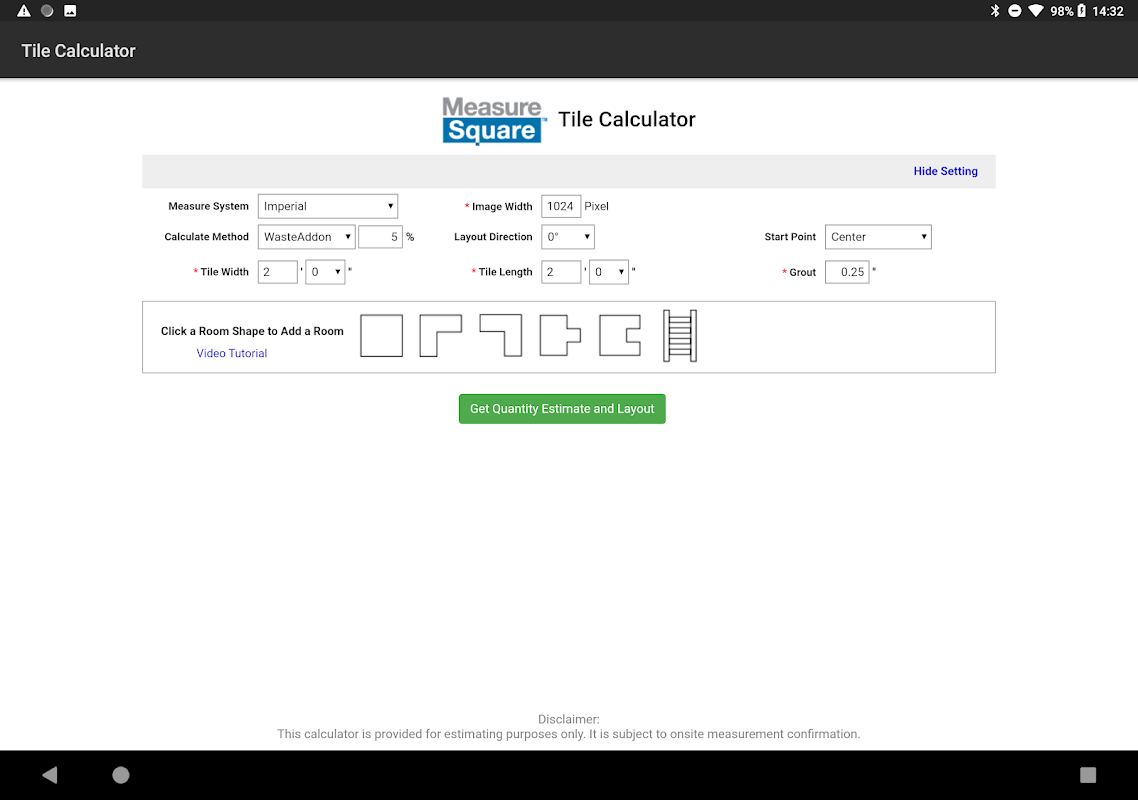 Meça Calculator Tile Square, um diagrama de layout de telha profissional e estimativa Quant. Ele estima baseado em tamanhos de azulejo, gap de argamassa, e ponto de partida de layout, e gera um relatório de estimativa com o número de peças necessárias, razão de resíduos, área útil e etc, e um diagrama de layout exato.