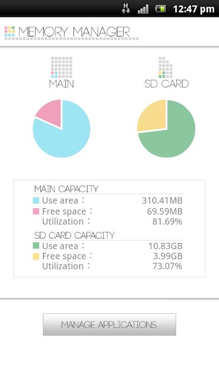 No ecrã de verificação de Memória, a utilização de memória do dispositivo e do cartão SD serão mostradas com clareza, com palavras e gráficos. No ecrã de gestão de memória pode remover aplicações inúteis.