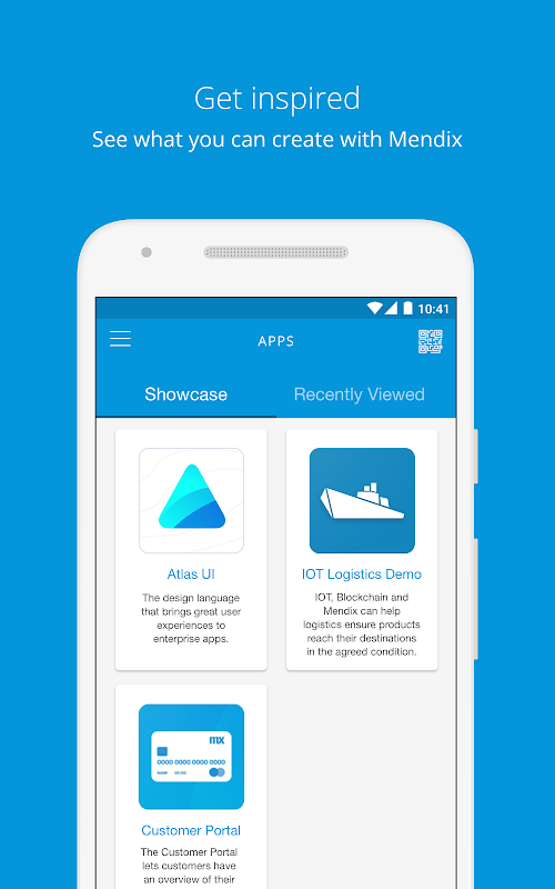A funcionalidade de leitura de código QR permite que você facilmente visualizar e testar seu aplicativo móvel em qualquer dispositivo - sem passar pelo incômodo de construir e instalar um pacote nativo específico do aplicativo. Para visualizar qualquer aplicativo móvel Mendix no seu aparelho, basta abrir o scanner QR e digitalizar o código mostrado na Mendix Modeler.