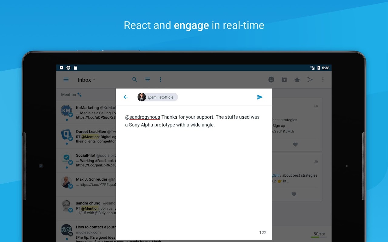 Create alerts on your company name, your brand, your competitor, be updated in real-time about the most relevant mentions over the web and react, get statistics, collaborate with your teams around them.