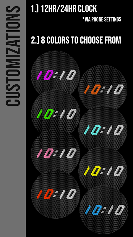 - Relógio de 12/24 horas (alterará automaticamente com as configurações do telefone)