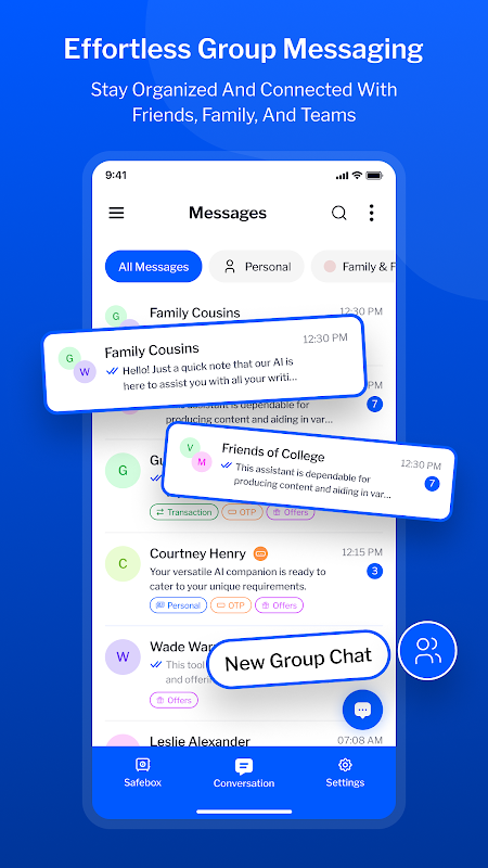 Nosso Organizador de SMS inteligente categoriza automaticamente suas mensagens de texto em Pessoais, Transações, OTPs e Promoções. Este aplicativo de Mensagens Inteligentes garante que suas mensagens mais importantes permaneçam em destaque.