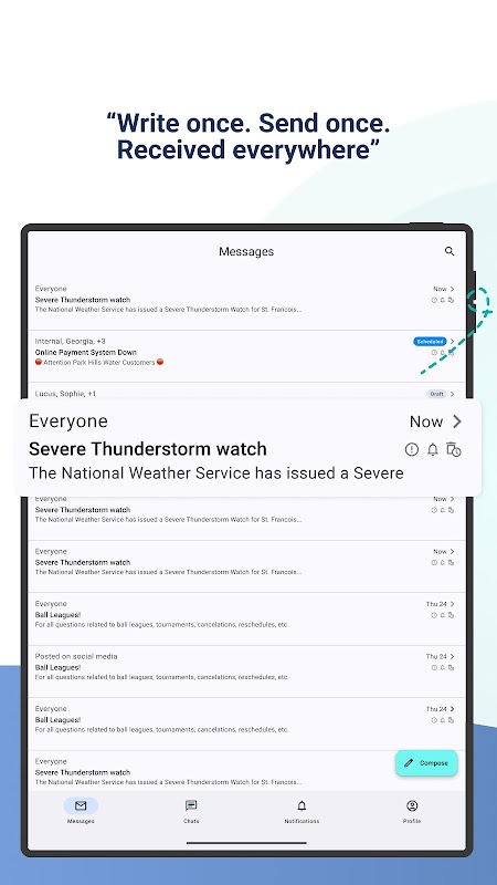 • Detalhes da mensagem: visualize detalhes da mensagem, incluindo destinatários, canais, título, corpo, reprodução TTS e opções de compartilhamento. Veja métricas de alcance, mostre/oculte histórico de mensagens da web, visualize em outros idiomas e gerencie mensagens de eventos.