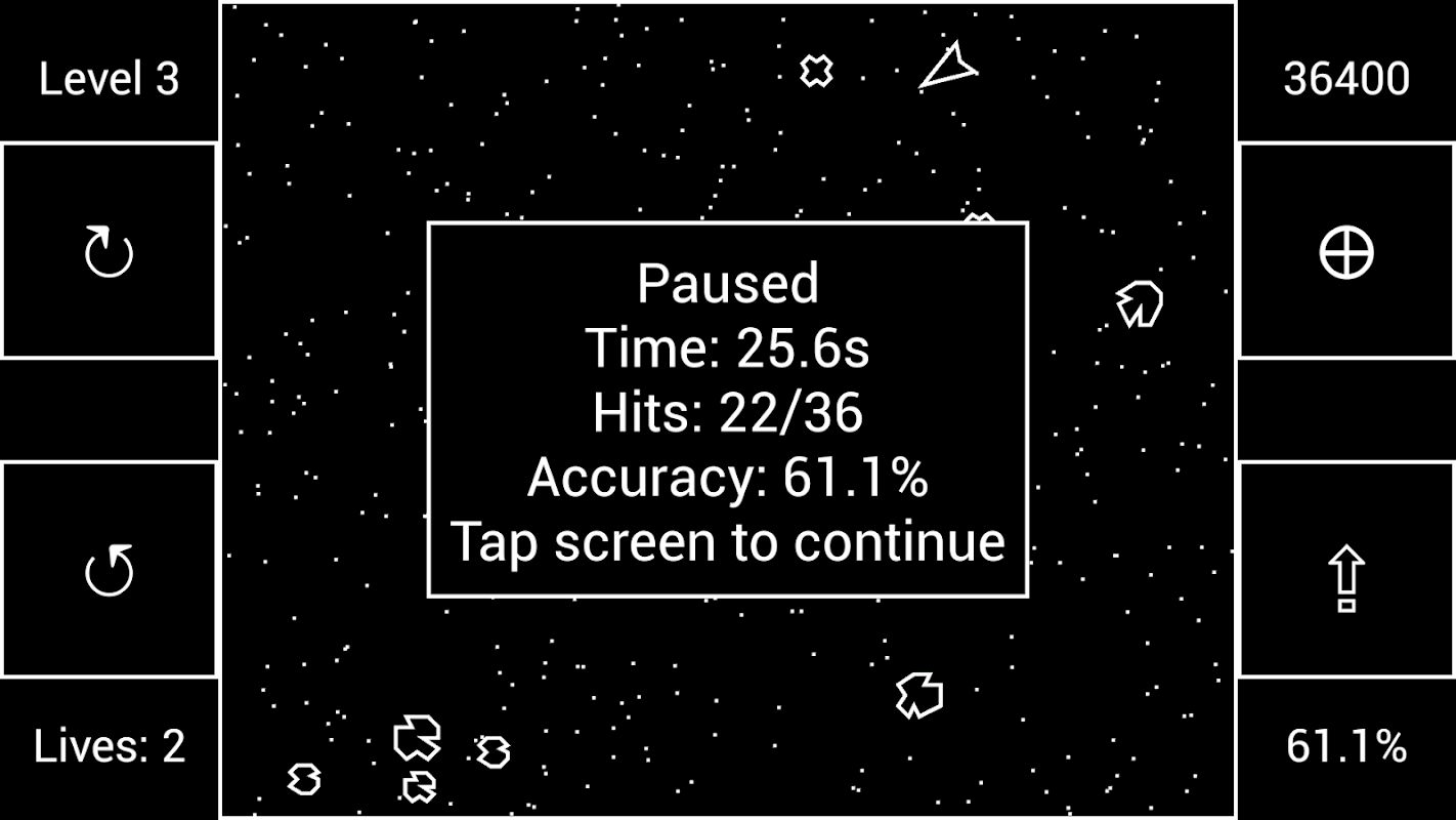Para um desafio adicional, experimente o modo de rotação inercial, em que sua nave continua girando quando você tira o dedo do botão. Evite ir muito rápido, pois sua nave é delicada e só pode lidar com muito estresse rotacional.
