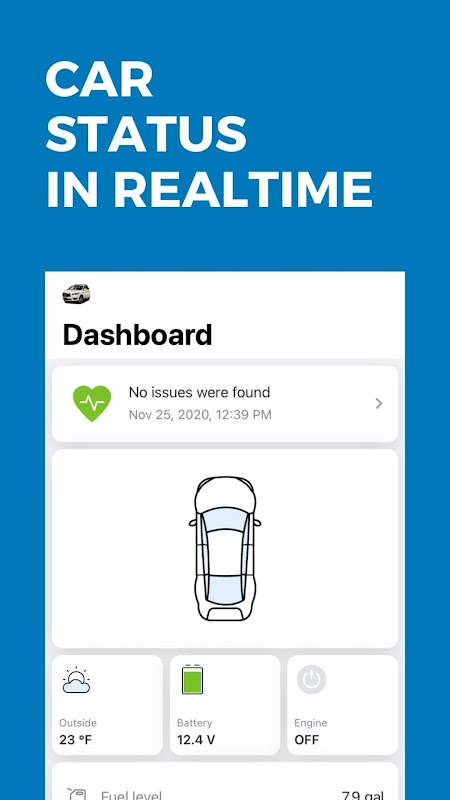 • Monitor vehicle status (car location, fuel level, mileage, battery condition)