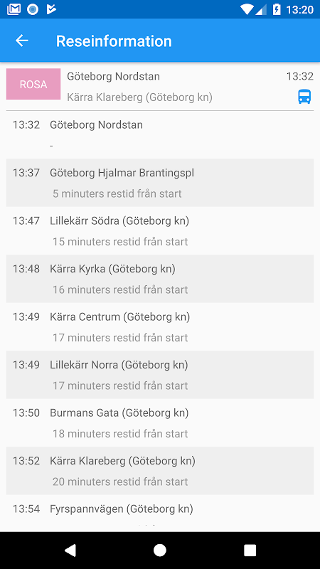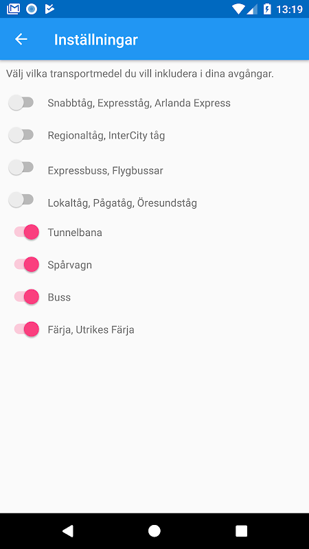 Mina Turer operates throughout the entire Swedens public transport and is based on real-time data, where appliciable.