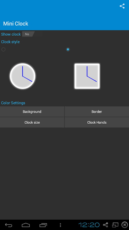 Mini clock which will be display top of all the screen. Its an customizable clock you can change the shape, background color, border color and hands color whatever your want.