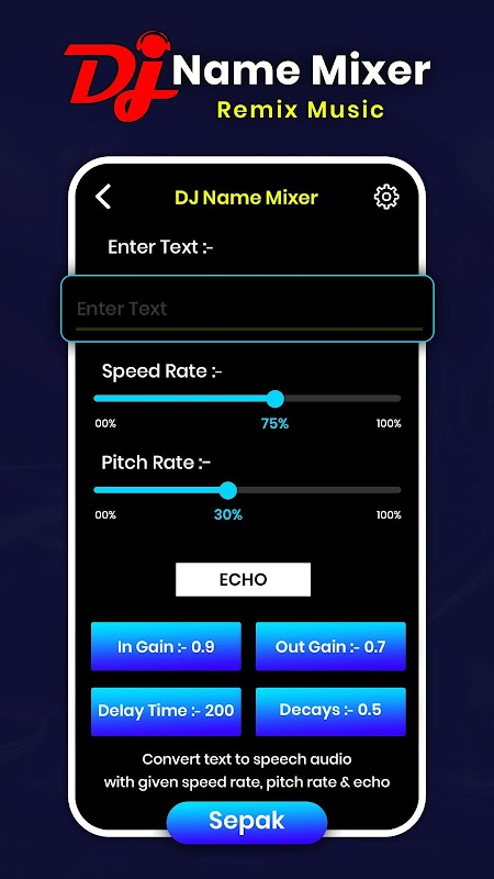 There is a special function given in DJ mixer is that, in text and in recorded sound you can also add effects if you want. You can also adjust the Echo voice, Pitch and Sound. After mixing your music you can set them as your ringtone and as notification tone also. DJ Name Mixer Mix Your Name to Song for creative people and music lover like you guys and in DJ Name Mixer Mix Your Name to Song application you will also be given some inbuilt music. DJ Name Mixer a very User friendly and responsive app.