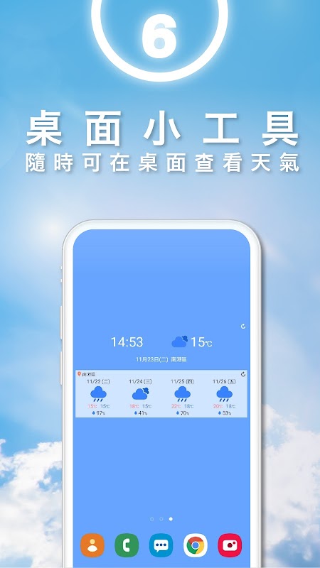 可以將天氣資訊設定在桌面,包含時鐘與天氣、現在即時天氣、今明兩天預報與未來四日天氣。
