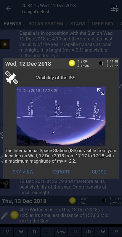 Do you want to know if the next lunar eclipse is visible from your location or when the next bright comet is visible? Would you like to be notified by your smart phone next time, Jupiter and the Moon meet in the sky? Do you want to know what the blazing bright object in the evening sky is? Do you want to be always up-to-date which celestial events that are visible from your location? Then this app is a must-have for you!