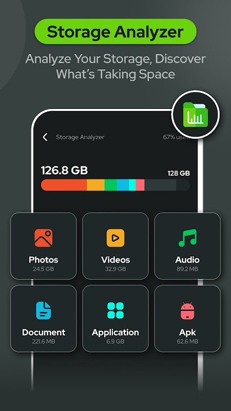 Obtenha uma visão simples do uso de armazenamento por Fotos, Vídeos, Áudios, Documentos, Aplicativos e APKs. Você pode tocar em qualquer categoria para visualizar arquivos e pastas em detalhes e, em seguida, selecionar um, vários ou todos os arquivos para exclusão. Para fotos e vídeos, você pode até mesmo visualizá-los antes de excluí-los.