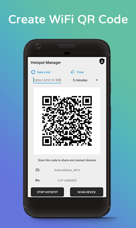 > We made our app very easy to use, so you can easily share your mobile data from your smart phone. To set up your free Wifi hotspot, you need only to type the network SSID name, choose if you want to secure it with WPA2_PSK or you want to keep it open, type the password and finally enter data limit in MB and Set Time if you want.