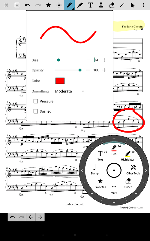 - Anotações para marcação de músicas, incluindo suporte para desenho de forma livre, formas básicas, texto e carimbos.