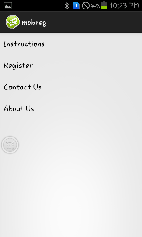 The application opens up with a Splash activity for one second. Then a menu presents itself which has four options that include: Instructions, Register, Contact Us, About Us.