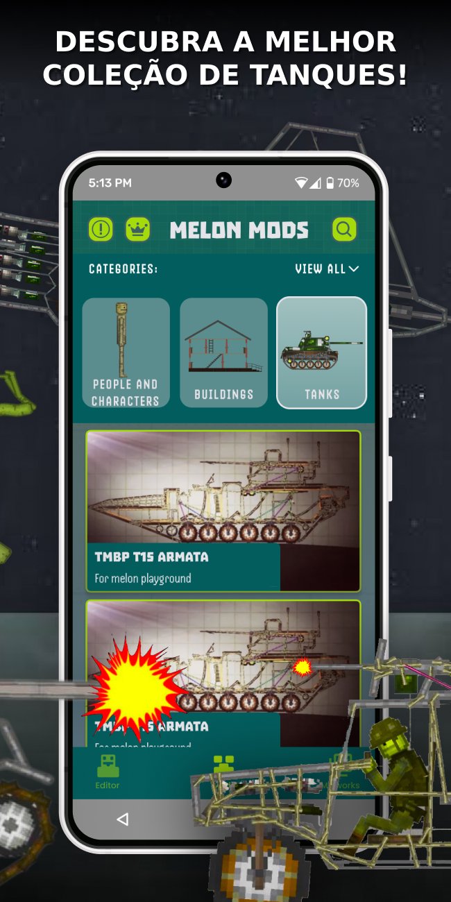 Libere sua criatividade com os mods Melon Playground e explore infinitas possibilidades. Assuma o comando de um formidável tanque de playground de melão, envolva-se em cenários intensos de guerra de playground de melão ou entregue-se a emocionantes conflitos históricos com o mod WW2 do playground de melão, onde você pode reescrever a história usando guerra baseada em melão.