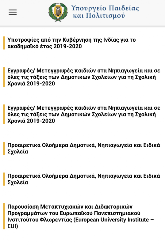 Pedido oficial do Ministério da Educação de Chipre, fornecendo informações e anúncios e informações para professores, pais e alunos.