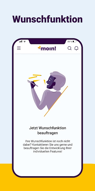 Olá! é individual. A maior vantagem é a personalização do aplicativo, porque cada empresa tem a oportunidade de solicitar novos recursos e funções individuais e comissioná-los diretamente. É assim que moin! adapte-se perfeitamente às necessidades da sua empresa.