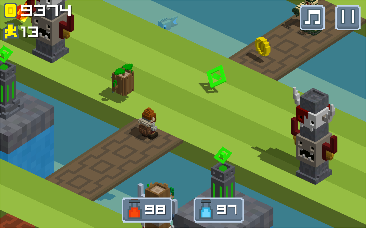 it will stop you to move forward when the monster and the fog appear in the Monster Valley,so if you use the red bottle, it will clear all the monsters in the screen, if you use the blue bottle it will clear the fog in the screen. It is pixel adventure style.
