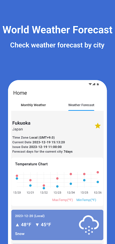- Digite qualquer cidade ou país para procurar a cidade desejada e verificar a previsão do tempo.