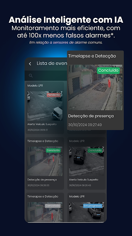 • Análise Inteligente com IA: Receba alertas e eventos gerados por nossas Inteligências Artificiais, como: