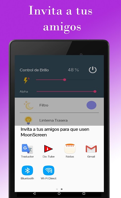 MoonScreen una aplicación que une dos funcionalidades que nunca pueden faltar en la cual puedes controlar el brillo de pantalla disminuyéndolo al máximo para que puedas disfrutar en las noches del uso del dispositivo y no hacerte daño en la vista ademas ahorra la energía de la batería porque la pantalla es la que mas corriente consume.