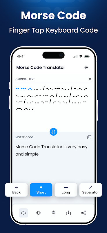 O aplicativo tradutor de Morse para texto oferece um teclado de toque com o dedo, com o qual você pode digitar o código Morse. O teclado tem um ponto para um toque curto, um traço para um toque longo e uma barra para um separador.
