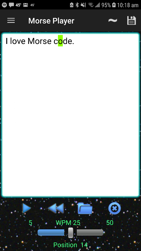 O Morse Player converterá o texto em sons do código Morse (CW). Possui dois modos, tempo real e codificação de arquivo de texto. No modo de tempo real, os caracteres digitados no teclado serão reproduzidos à medida que forem digitados. No modo de arquivo, um arquivo pode ser carregado e reproduzido como CW. Usar o Morse Player é uma boa maneira de deixar de conhecer os caracteres do código Morse e ouvir palavras. Ele não foi projetado para ser especificamente um treinador, mas os arquivos de treinamento podem ser gerados e usados para aprender os personagens. Por exemplo, criei arquivos com indicativos de rádio amador para ajudar no reconhecimento de indicativos de chamada para concursos de rádio amador da CW. Além disso, usar o modo em tempo real e digitar os caracteres é uma boa maneira de aprender seus sons. Livros gratuitos de domínio público em http://www.gutenberg.org podem ser baixados e reproduzidos como código Morse no Morse Player. Ouvir esses livros no código Morse é uma boa maneira de melhorar as habilidades de cópia conversacional da CW. O único formato de arquivo suportado é UTF-8.