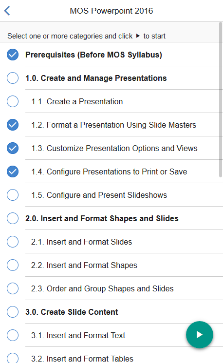 This App provides the users with the opportunity to get an initial picture about the MOS Certiport 77-729 Exam, which lead to the respective Certificate acquisition for MS-Powerpoint 2016.