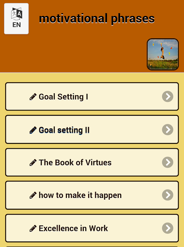 O próximo aplicativo você terá acesso a alguns dos mais famosos da história frases motivacionais. Em baixas momentos de leitura de uma frase motivacional pode ser chave para quebrar os limites que a nossa mente cria a superar vários obstáculos que surgem à vida.