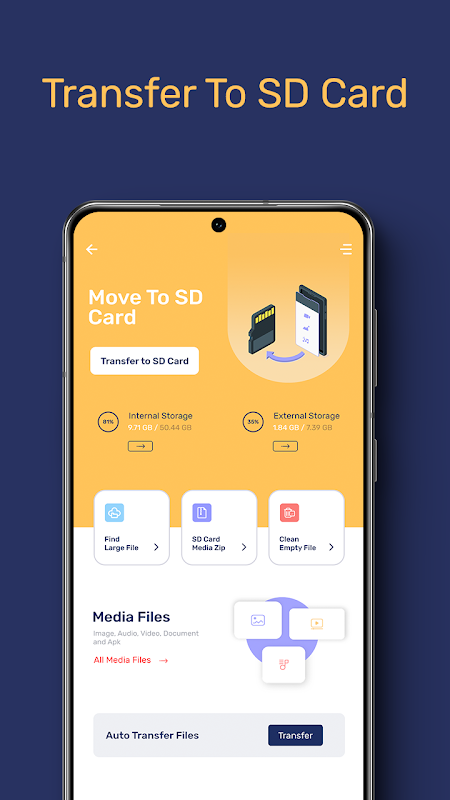 Arquivos para cartão SD é uma solução rápida de um clique para mover seus arquivos da memória interna para o cartão SD em seu telefone. Mova seus aplicativos, fotos, vídeos e todos os outros arquivos para o cartão SD. O aplicativo Transfer To SD Card é útil para dispositivos com pouca memória interna e que não permitem salvar seus arquivos diretamente no cartão SD.