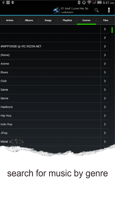 You can play music by playlist, song title, genre, artist, can also look in the file folder, such as the download folder, where the downloaded music from the Internet put. Mp3 music player free.