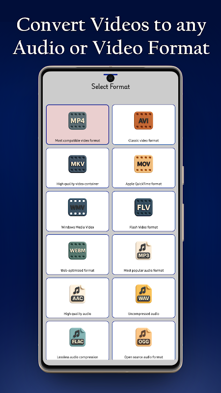 De usuários casuais a entusiastas de mídia, o MPEG Video Player & Converter foi criado para você. Assista a vídeos, extraia áudio para ouvir em qualquer lugar ou gerencie sua mídia com facilidade. O design intuitivo garante uma experiência tranquila para iniciantes e usuários avançados.