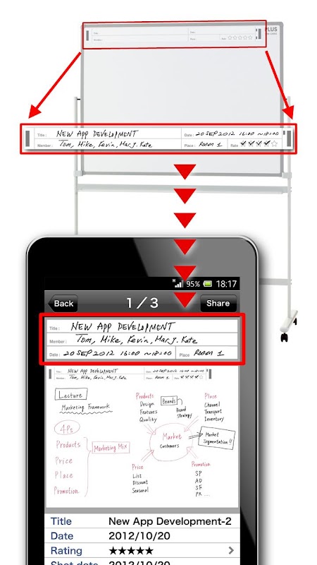 Este aplicativo facilita a organizar os escritos do quadro branco, otimizando a imagem instantâneo usando tecnologia de reconhecimento único quadro, como correção de pedra fundamental. Os dados salvos podem ser organizados por pastas, enviados por e-mail, enviado para Evernote, Dropbox e pode ser guardado para Rolo da Câmera.