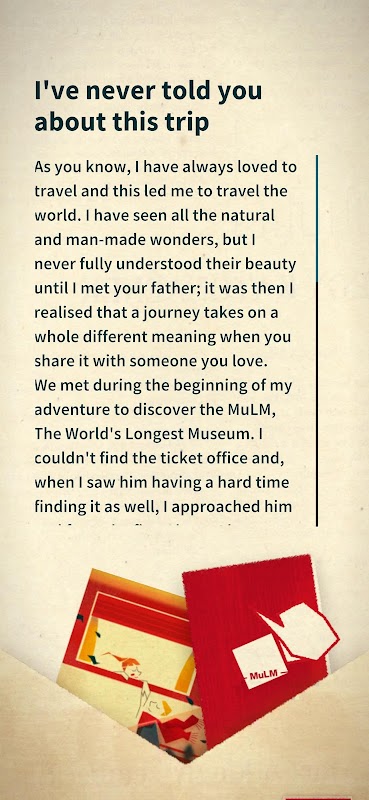 Com o aplicativo MuLM você poderá descobrir não apenas todos os lugares que podem ser visitados neste "museu" particular, mas também brincar e se emocionar, graças a uma bela história que o acompanhará em sua jornada para descobrir o MuLM!
